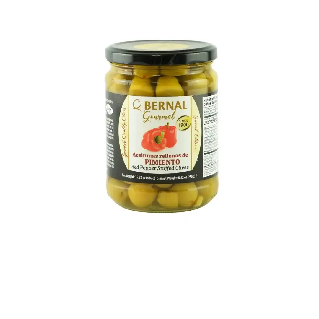 Pitted manzanilla olives stuffed with cooked red pepper.