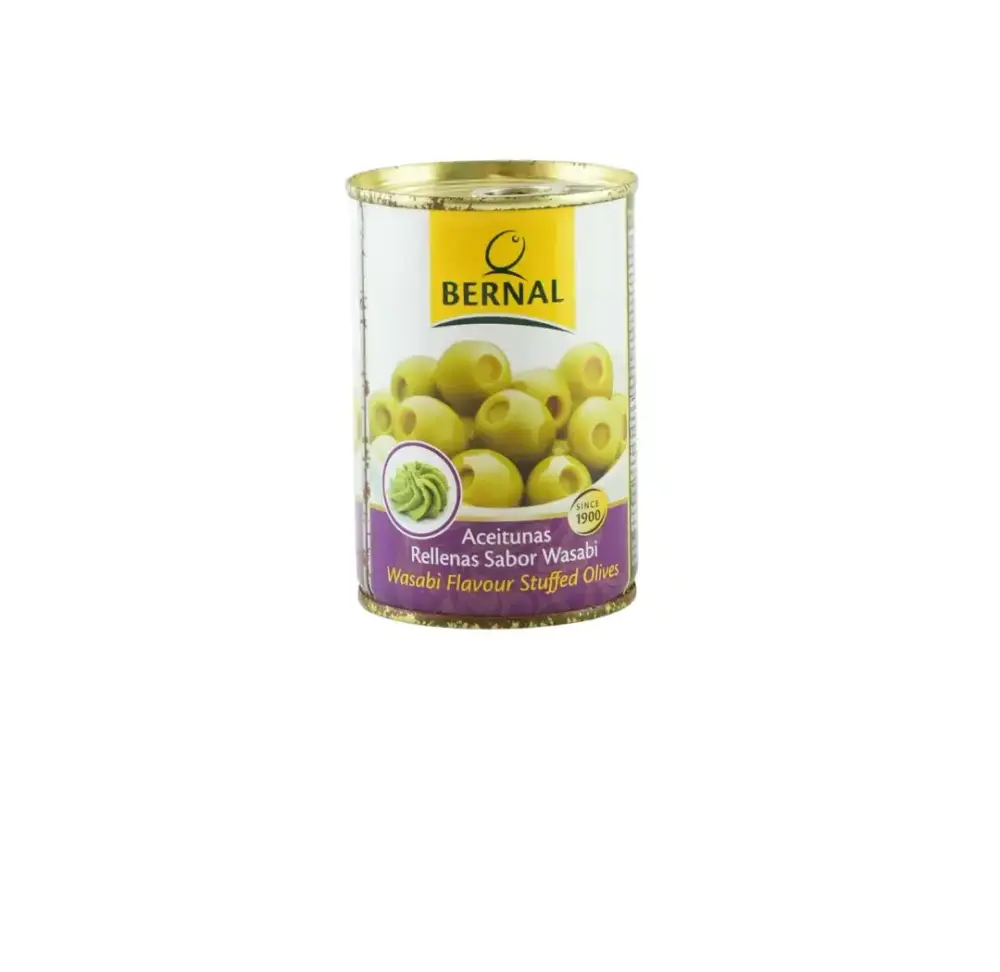 Green manzanilla olives with a kick of wasabi. Deliciously complimented by a cold glass of beer.