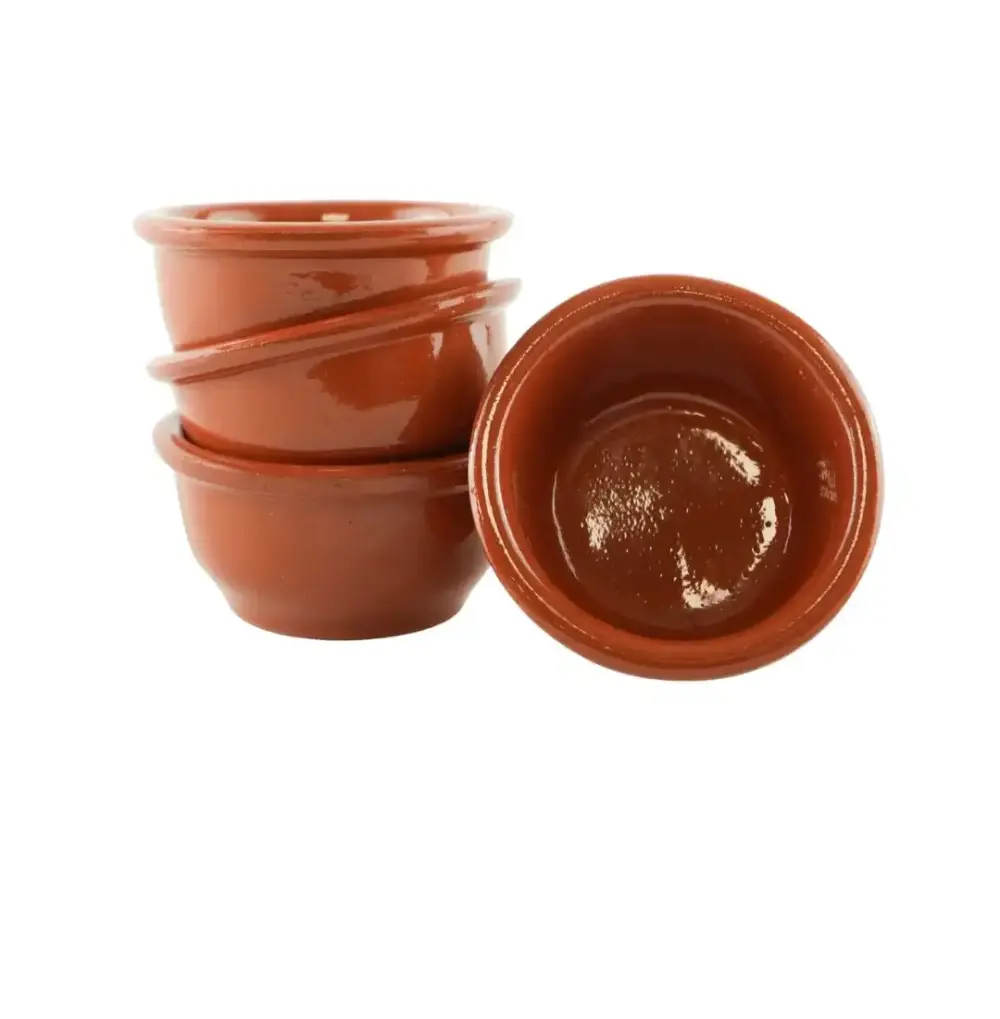 Hermanos Vinagre based in Salamanca uses the red clay of Salvatierra de los Barros, a traditional pottery city on the peninsula and carries out traditional methods to produce their work. This pack contains 4 small dishes 6 cm in diameter and are perfect for serving allioli or romesco sauce .